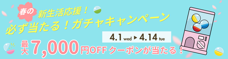 現在、最大7,000円OFFクーポンが当たる 「春の新生活応援♪ガチャキャンペーン」を実施中です。 ガチャを回して、お得なクーポンをGET!